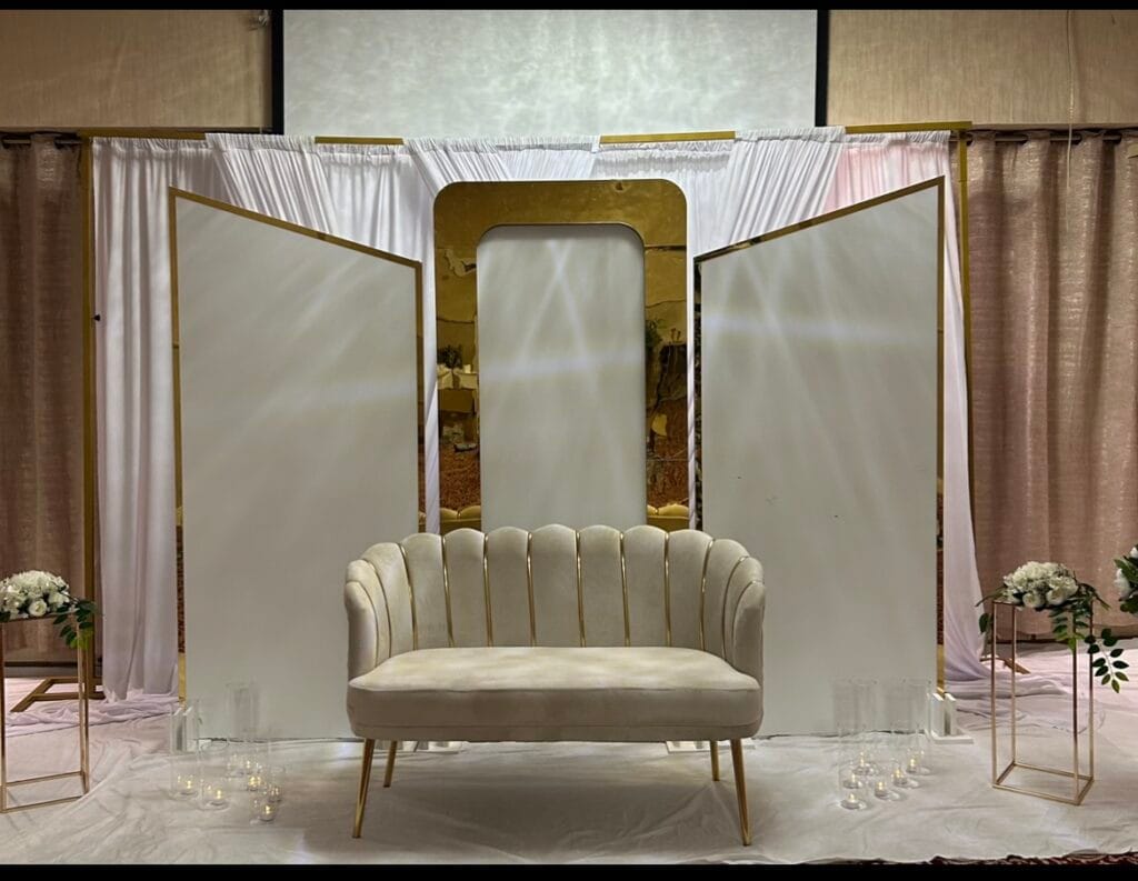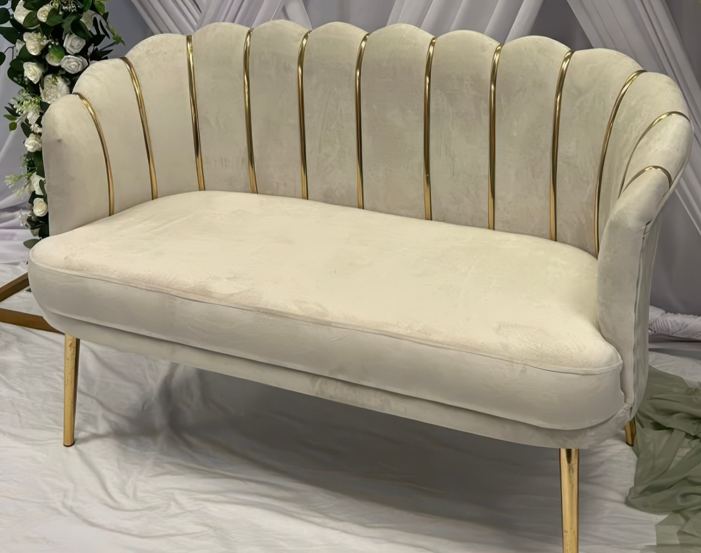 A sophisticated gold design with a plush white cushioned sofa, ideal for adding royal elegance to your event.